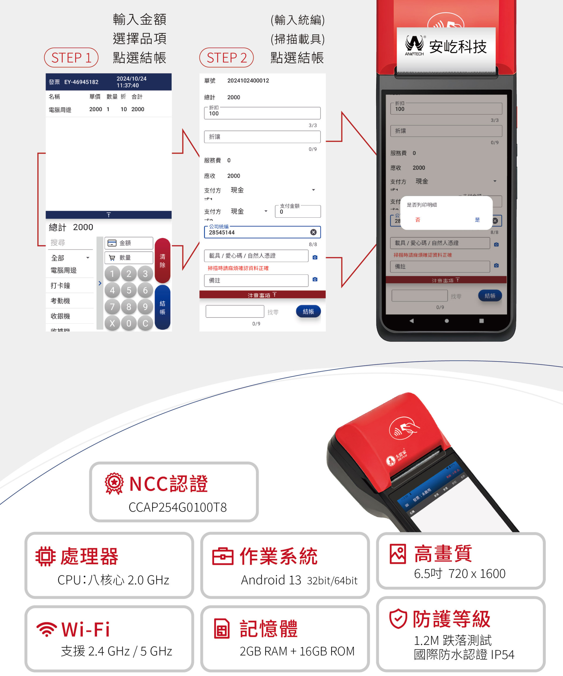- 支援無線WIFI,即時上傳發票資料,手機開熱點分享也OK